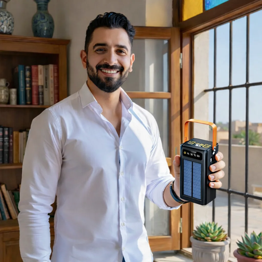 يمكن شحن البطارية بالكهرباء أو بالطاقة الشمسية، مما يجعلها حلًا عمليًا في فترات الانقطاع الطويلة بدون الحاجة لمصدر كهرباء دائم.
