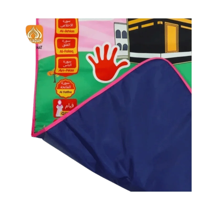 تم تصميم هذه السجادة لمساعدة الأطفال على تعلم الصلاة بأسلوب محبب وبسيط، مما يعزز ارتباطهم بالصلاة منذ الصغر. رسومات واضحة توضح أوضاع الصلاة، تصميم ملون وجذاب للأطفال، رموز إسلامية تعليمية ومحترمة.